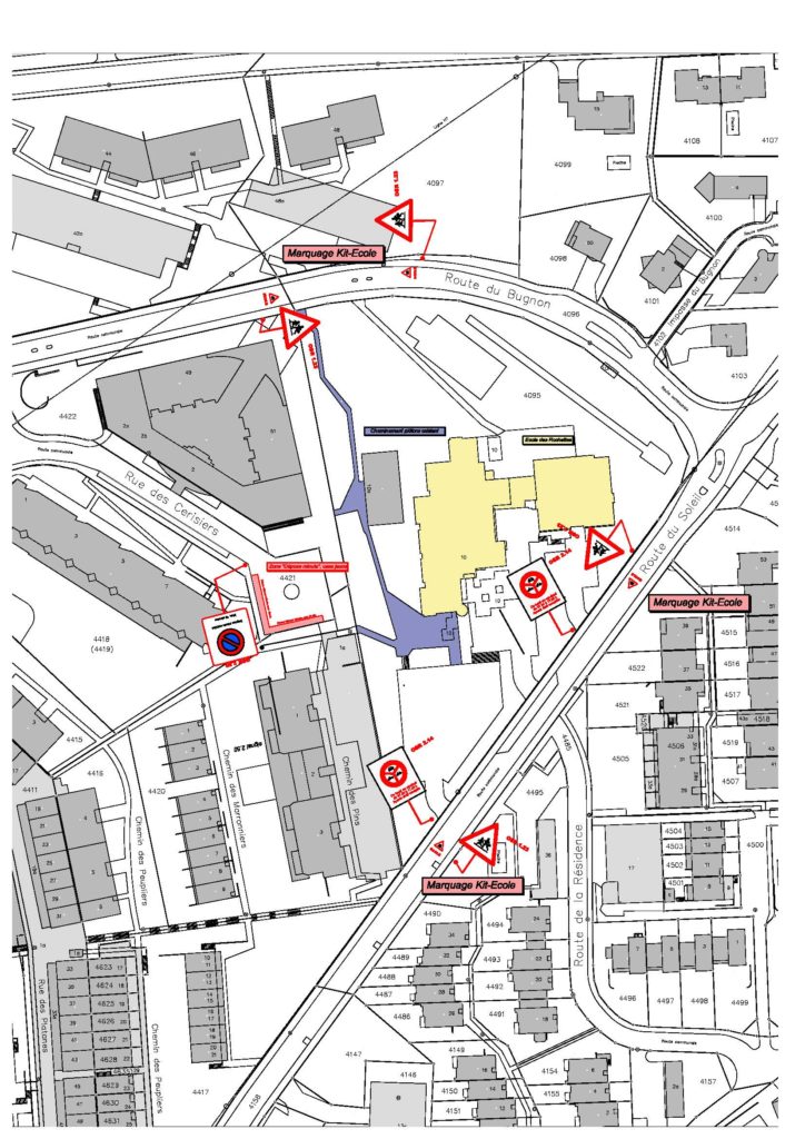 Si des parents doivent prendre une voiture pour conduire leurs enfants, des places de stationnement sont prévues à cet effet : Rue des Cerisiers, zone « dépose-minutes » sur les cases jaunes.